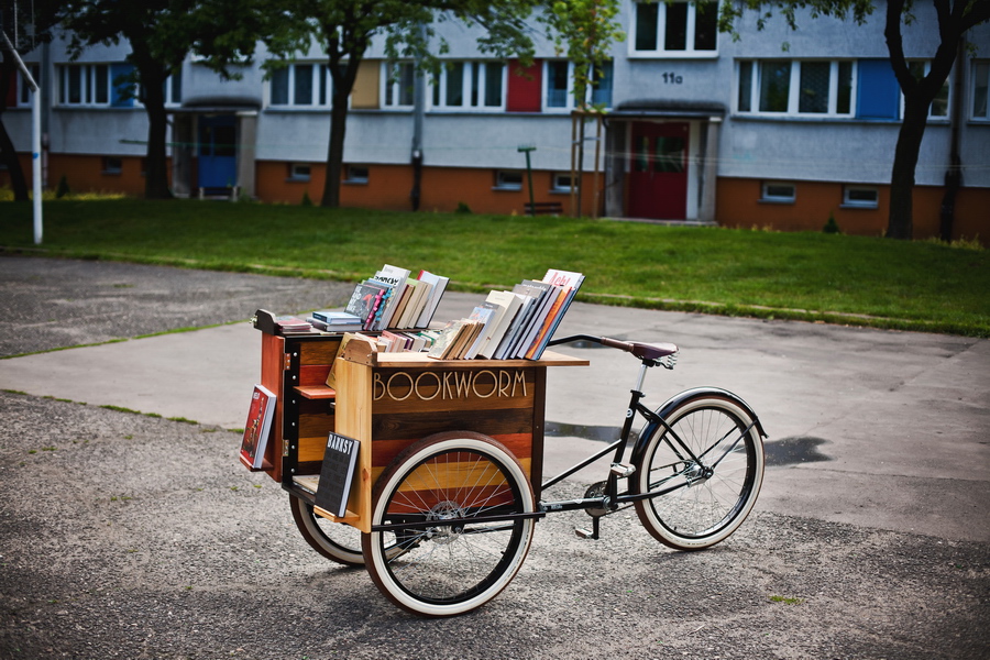 Rower dla grupy rowerowej Oleśnica Bajk Stajl, zrobiony jako uliczna biblioteka z drewnianą otwieraną skrzynią która służy jako półki na książki. Całość robiona od podstaw specjalnie do tego roweru.