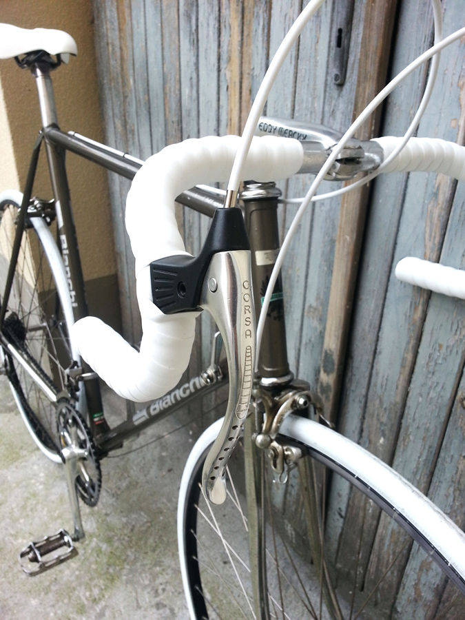 Klasyczna włoska Bianchi w stanie idealnym. Tej marki nie trzeba przedstawiać, większość legend kolarstwa używała podobnych rowerów. Szosa jest po przeglądzie, ma nowe opony, siodełko, owijkę i linki. Reszta przesmarowana i kręci się jak należy.
